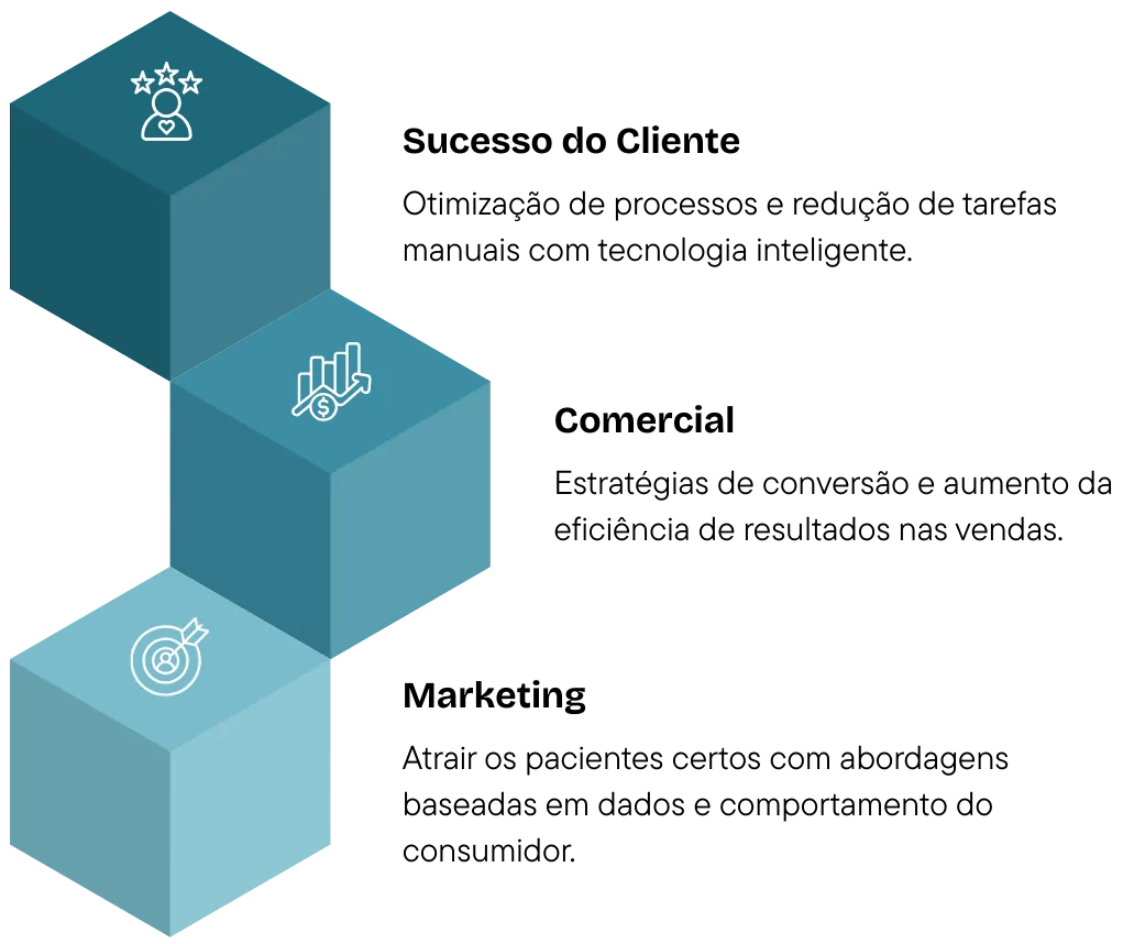 Nossa metodologia ativa os três motores do seu crescimento, alinhando seu Marketing para encher a agenda, seu time Comercial para maximizar o faturamento e o Sucesso do Cliente para criar uma base de pacientes leais.